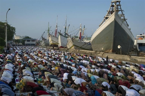 | Des musulmans indonésiens lors de la prière matinale marquant la fin du ramadan, le 8 août 2013 à Jakarta. |