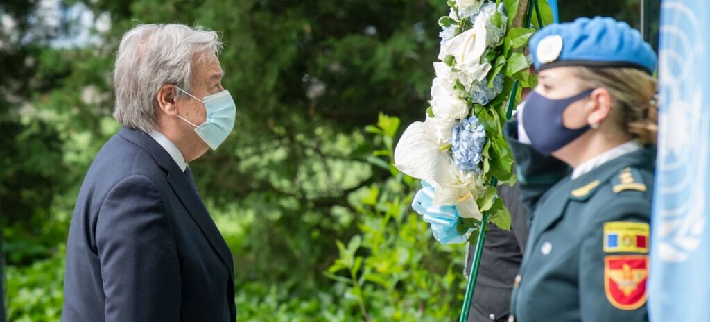 | Le Secrétaire général de l'ONU, António Guterres (à gauche), dépose une gerbe de fleurs en hommage aux Casques bleus qui ont perdu la vie au service de l'ONU. |
