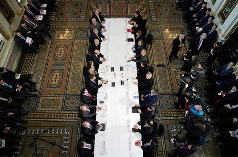 | Les délégations américaine et chinoise de retour à la table des négociations, le 21 février à Washington. |