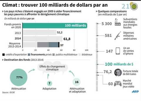 Concernant les financements, les pays en développement tiennent à ce que les 100 milliards de dollars annuels promis par les pays développés à partir de 2020 soient une somme "plancher", régulièrement revue à la hausse.