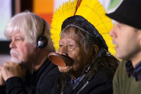 | De gauche à droite, Paul Watson, patron de la Sea Shepherd Conservation Society, le Brésilien, Raoni Metuktire, l'un des grands chefs du peuple Kayapo et Gert-Peter Bruch, président de l'association Planète Amazone, le 10 décembre à la COP21 à Paris. |