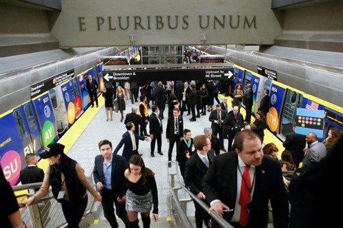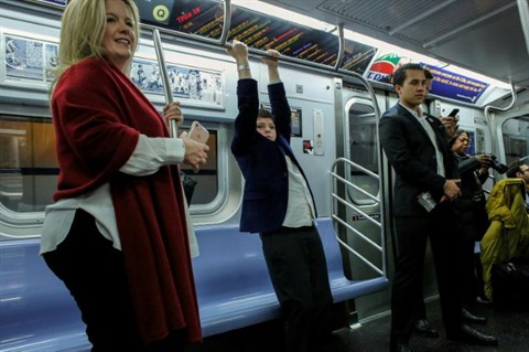 | Des voyageurs dans le métro dont de nouvelles stations ont été inaugurées, le 31 décembre 2016 à New York. |