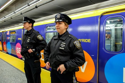 | Des policiers devant le métro dont de nouvelles stations ont été inaugurées, le 31 décembre 2016 à New York. |