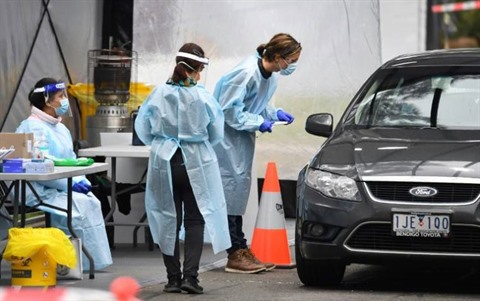 | Un centre de dépistage en drive-in, le 13 août à Melbourne, en Australie. |