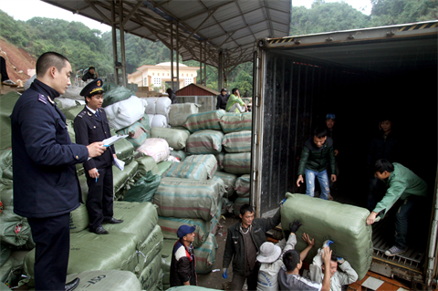 | Contrôle douanier à une porte-frontière dans la province de Lang Son, au Nord. |