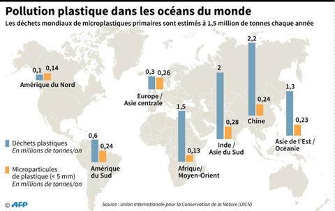 Les particules invisibles de plastique représentent une part importante de la "soupe plastique" qui encrasse les eaux, soit entre 15 et 31% des quelque 9,5 millions de tonnes de plastique déversées chaque année dans les océans, indique l'Union internationale pour la conservation de la nature (IUCN) dans un rapport.