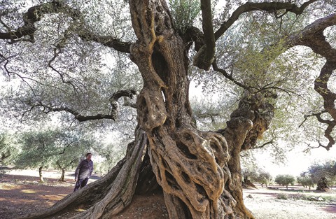| Un homme regarde l’olivier millénaire, «personnage» célèbre dans le film The Olive du réalisateur espagnol Iciar Bollain. |