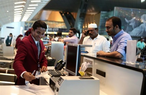| Enregistrement de passagers au comptoir Qatar Airways à l'aéroport Hamad de Doha le 12 juin. |