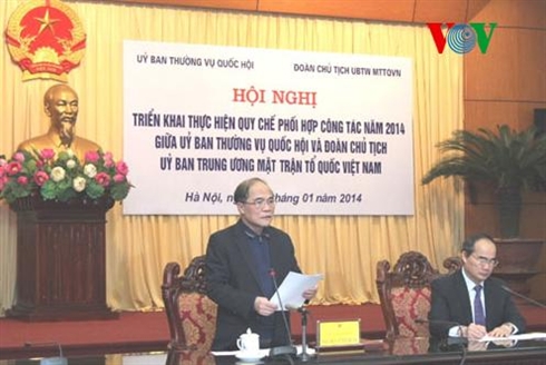 Lors d'une conférence organisée vendredi 10 janvier à Hanoi afin de dresser le bilan de 2013 et de lancer le plan de coordination pour 2014 entre ces deux organes, le président de l'Assemblée nationale leur a recommandé de collaborer étroitement dans la vulgarisation des points de la Constitution de 1992 dans sa rédaction de 2013. Il a également insisté sur la nécessité de renforcer la coopération bilatérale afin de mieux comprendre les opinions des électeurs et mieux superviser le traitement de leurs recours.