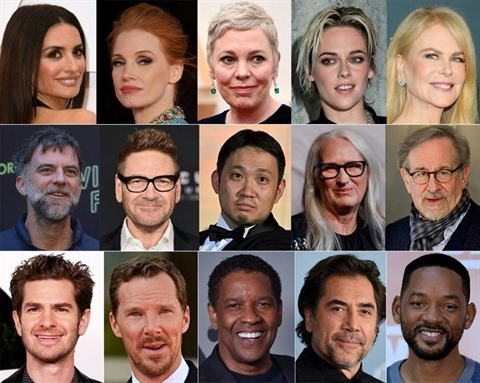 | Collage des nominés pour les Oscars, avec de gauche à droite et de haut en bas : Penelope Cruz, Jessica Chastain, Olivia Colman, Kristen Stewart, Nicole Kidman, Paul Thomas Anderson, Kenneth Branagh, Ryusuke Hamaguchi, Jane Campion, Steven Spielberg, Andrew Garfield, Benedict Cumberbatch, Denzel Washington, Javier Bardem et Will Smith. |