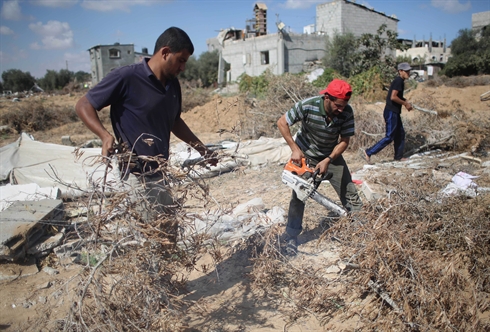 | Des paysans palestiniens dans le village de Khuzaa, au sud de la bande de Gaza, remettent en état leurs terres qui a été endommagé par l'armée israélienne, le 2 septembre. |
