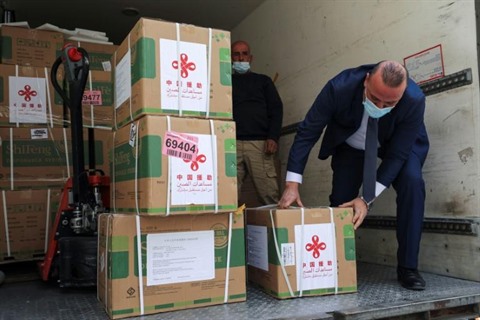 | Des membres du ministre de la Santé palestinien déchargent des lots de vaccin chinois anti-Covid Sinopharm donnés par Pékin, le 29 mars à Ramallah, en Cisjordanie. |
