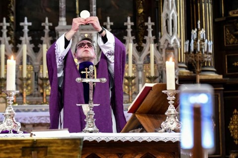 | Le curé d'Illiers-Combray (Eure-et-Loire), Olivier Monnier, célèbre la messe seul devant des fidèles connectés, le 3 avril. |