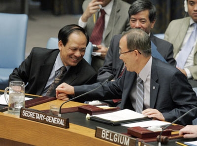 | Le secrétaire général de l’ASEAN, Lê Luong Minh (gauche), et le secrétaire général de l’ONU, Ban Ki-moon |
