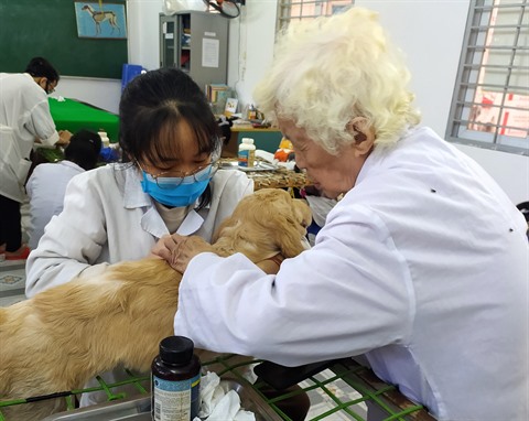 Dans une salle de 30m2 de la Clinique vétérinaire communautaire de la rue Ngô Xuân Quang (district de Gia Lâm, en banlieue de Hanoï), Pham Thi Xuân Vân (née en 1932) apprend aux étudiants de l’Université nationale d’agriculture du Vietnam à masser les chiens et les chats paralysés pour les préparer à une session d’acupuncture.