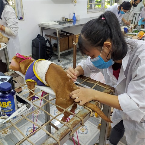 Pour Pham Thi Ngoc Hang, étudiante de dernière année de la Faculté de médecine vétérinaire de l’Université national d’agriculture du Vietnam, le travail ici est un peu stressant parce que les chiens et chats sont paralysés et handicapés, il faut les soigner avec beaucoup de précaution. Néanmoins, "à chaque fois qu'une cure d'acupuncture réussit, je me sens très heureuse. Travailler ici me donne un avantage en acupuncture. De plus, nous sommes formés à être méticuleux, précis et patients lors de la prise en charge des animaux de compagnie".