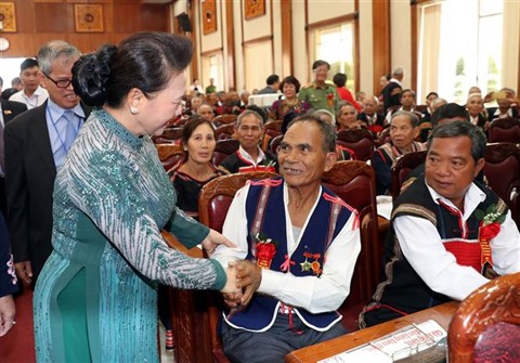 La présidente de l’Assemblée nationale a déclaré apprécier les contributions importantes des ethnies du Tây Nguyên, notamment celles des patriarches, au développement régional et national. Elle a émis le souhait que les patriarches et les personnes âgées des villages des ethnies du Tây Nguyên continuent d’encourager les habitants locaux à observer les politiques et les lois du Parti et de l’État, à développer les belles valeurs culturelles, à éliminer des mœurs reculées dont le mariage précoce… Elle a également demandé aux autorités locales de s’intéresser davantage à la formation et au recrutement des personnes issues des ethnies minoritaires.