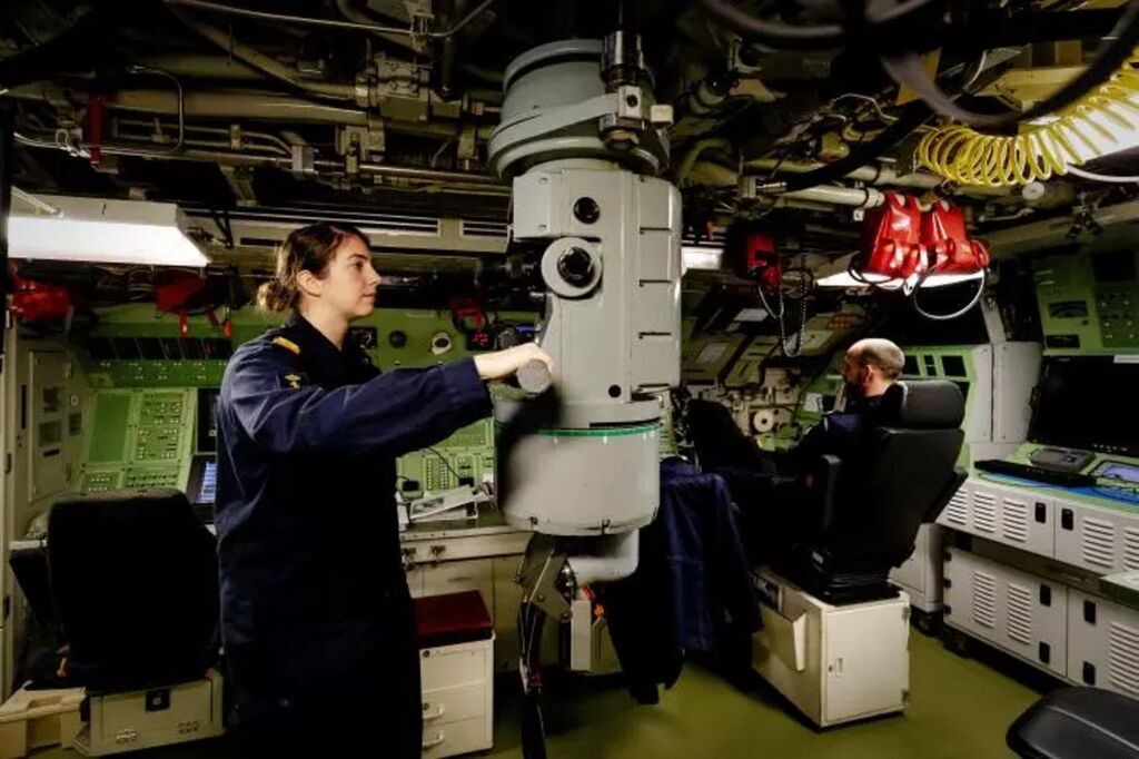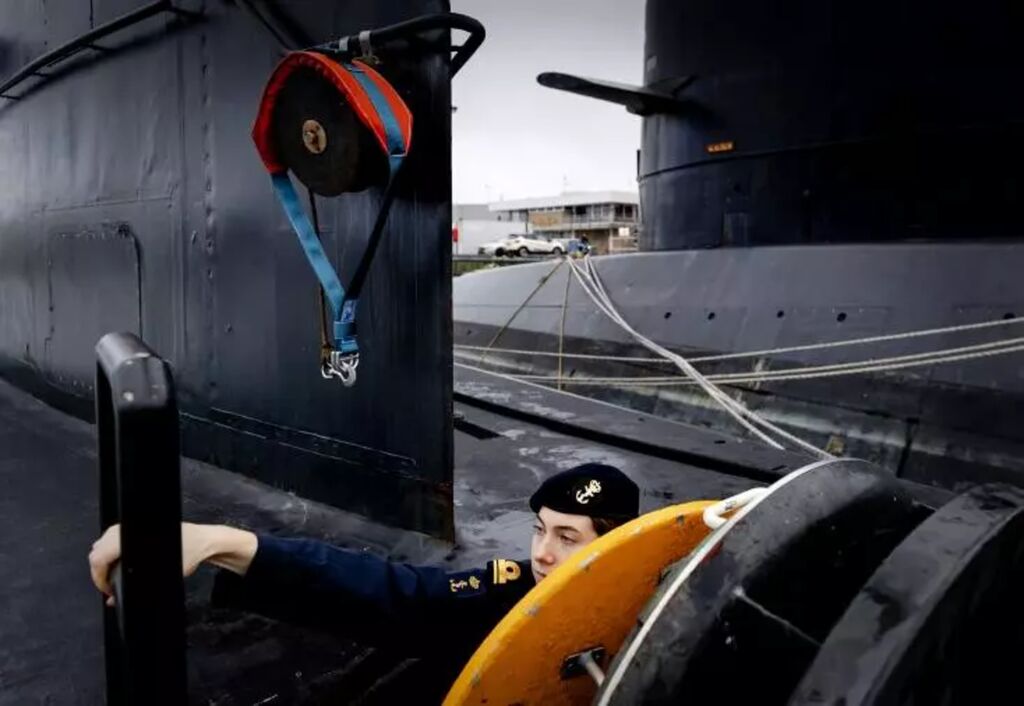 | Une membre de l'armée néerlandaise travaille à bord d'un sous-marin au Helder aux Pays-Bas. |