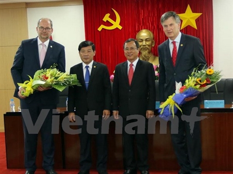 | Les dirigeants de la province de Binh Duong avec les maires des deux villes néerlandaises d'Hoovegeen et d'Emmen, le 9 mars dans cette province. |