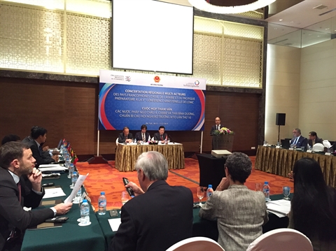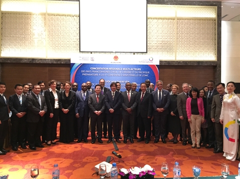 | Des représentants des pays francophonies d’Asie, des Caraïbes et du Pacifique lors de la concertation régionale multi-acteurs préparatoire à la 10e Conférence ministérielle de l’OMC, le 30 novembre à Hanoi. |