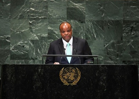 | Le roi Mswati III du eSwatini à la tribune de l'Assemblée générale de l'ONU, le 26 septembre à New York. |