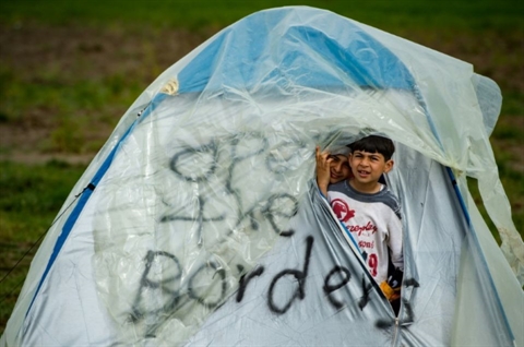| Deux garçons dans une tente marquée "Ouvrez les frontières" dans un camp de migrants à la frontière gréco-macédonienne près du village d'Idomeni, le 24 mars |