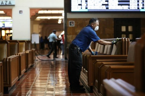 | Les fauteuils d'une salle d'attente de la gare Union Station de Los Angeles sont nettoyés, le 13 mars 2020. |