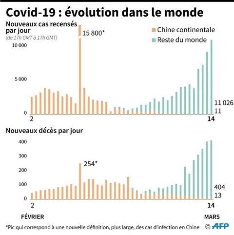 Devant la progression de la pandémie, le monde se calfeutre toujours plus: Madrid a pris des mesures particulièrement radicales avec une quarantaine quasi-totale et a décrété l'état d'alerte pour quinze jours. L'Espagne est le deuxième pays le plus touché d'Europe avec 5.753 cas et quatrième pays au monde en nombre de décès avec 183 morts.
