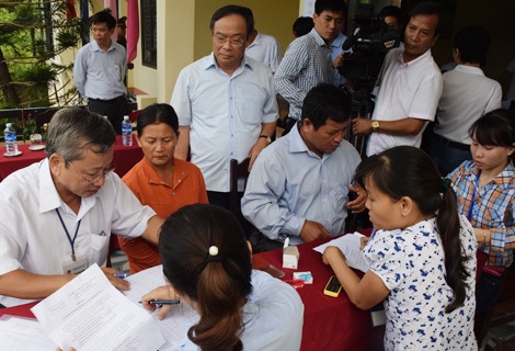 | Le président du Comité populaire de la province de Thua Thiên-Huê, Nguyên Van Cao (debout) inspecte le travail de paiement d’indemnités aux pêcheurs sinistrés par l’incident écologique causé par Formosa. |