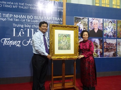 | La collectionneuse Thuy Khuê remet une peinture de Lê Thi Luu au représentant du Musée des beaux-arts de Hô Chi Minh-Ville. |