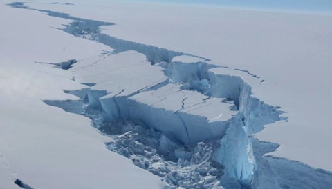 | Image tirée d'une vidéo du British Antarctic Survey d'une crevasse dans la gigantesque plateforme de glace Larsen C en juillet 2017 dans l'Antarctique. |