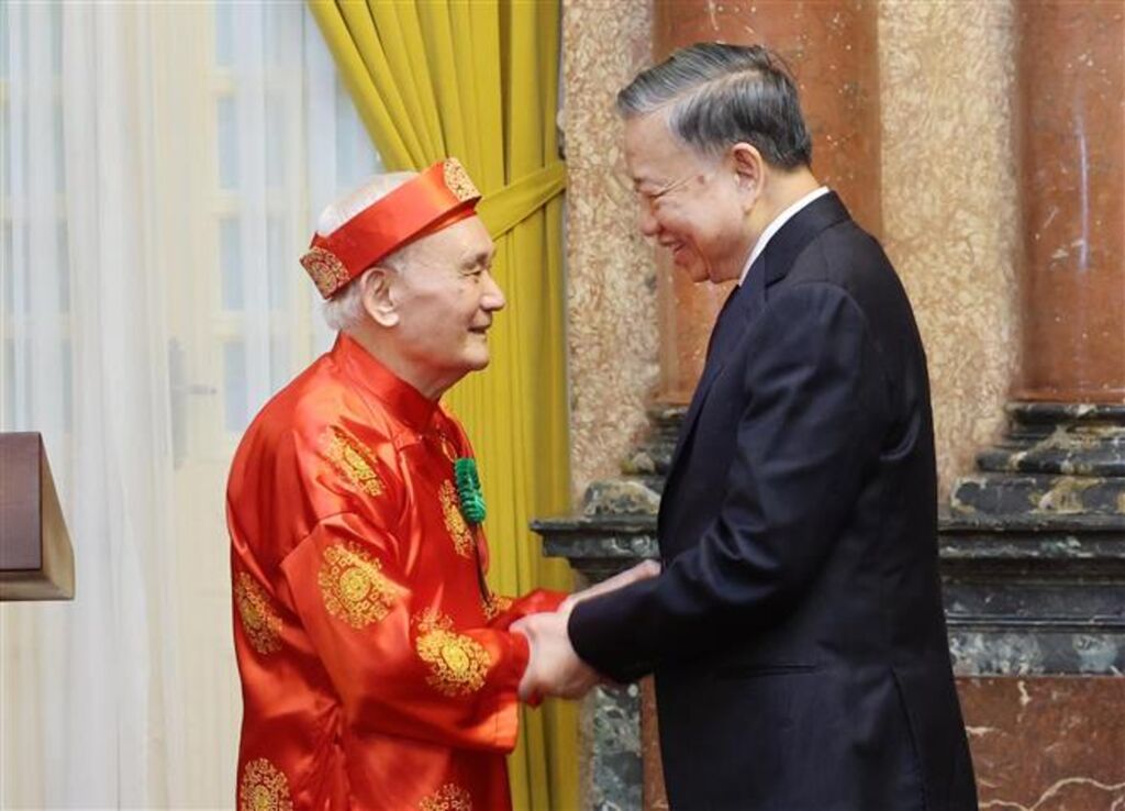| Le président Tô Lâm (droite) rencontre Nguyên Tu, 96 ans, domicilié à Hanoï, ancien directeur adjoint de l'Académie de médecine militaire, le 6 juin. |