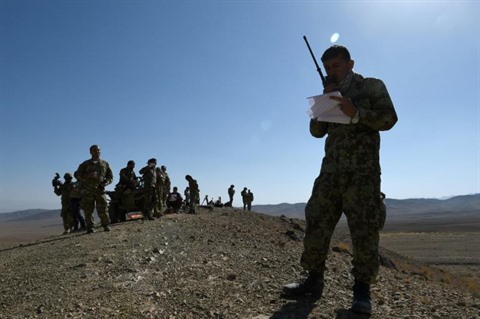 | Un contrôlleur tactique aérien afghan en relation avec un pilote lors d'un exercice dans la province de Logar le 18 octobre. |