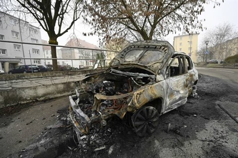 | Photo prise le 1er janvier 2020 d'une voiture brûlée dans le quartier de Neuhof, en périphérie de Strasbourg, le 31 décembre 2019. |