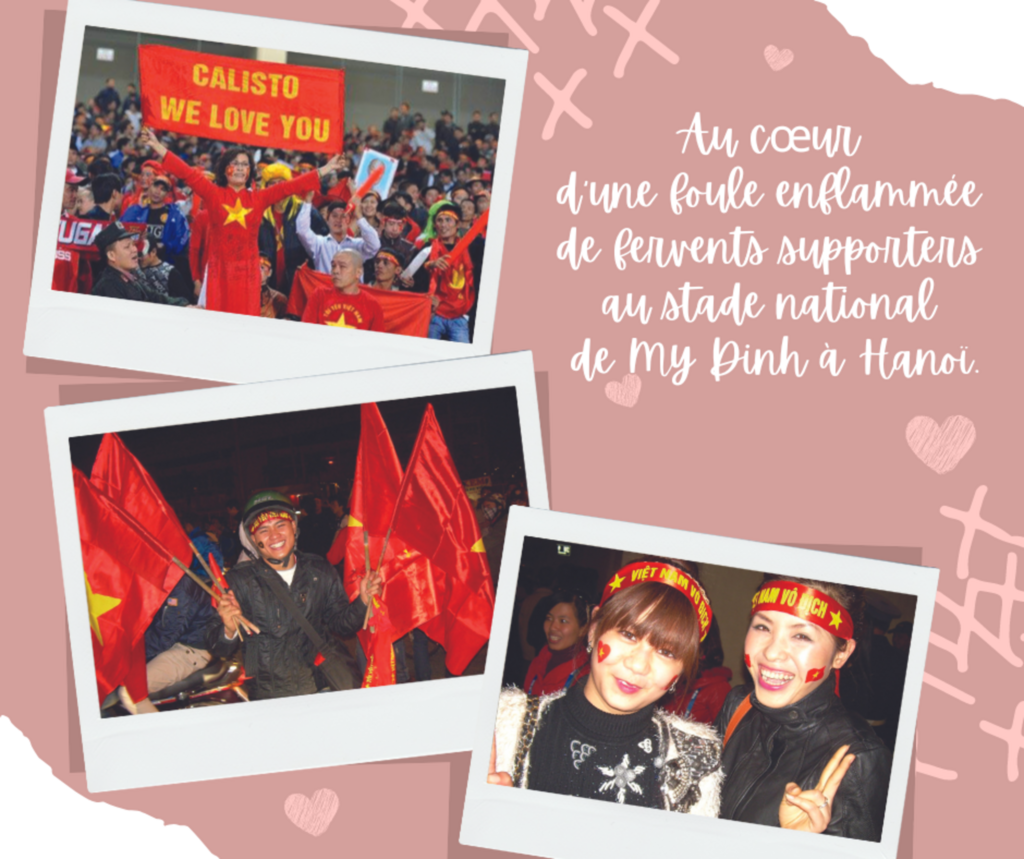 Autour de nous, les petits hommes rouges envahissent l’espace, marée incontournable de drapeaux rouges frappés d’une étoile jaune, le drapeau du Vietnam. Sur des bandeaux noués autour du front ou des petits cœurs autocollants sur les joues, ils sont partout. Impossible d’y échapper.