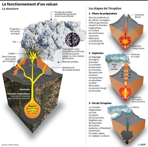 Selon les géologues, le volcan reste actif, crachant de la lave incandescente à quelque 500 m de hauteur depuis de nouvelles fissures qui se sont ouvertes sur son flanc nord, avec des tremblements de terre dans la zone.