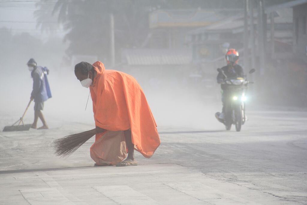 | Des locaux nettoient des centres expulsés par l'éruption volcanique de Bulusan, aux Philippines. |