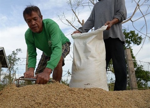 | Un agriculteur philippin ramasse des grains de riz dans la province de Cagayan. |