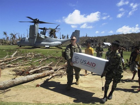 | Soldats américians et philippins collaborent pour apporter de l’aide aux victimes du typhon Haiyan aux Philipines le 18 novembre 2013. |