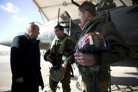 | Le ministre français de la Défense, Jean-Yves Le Drian, avec des pilotes français sur une base jordanienne de la coalition, le 1er janvier 2016. |