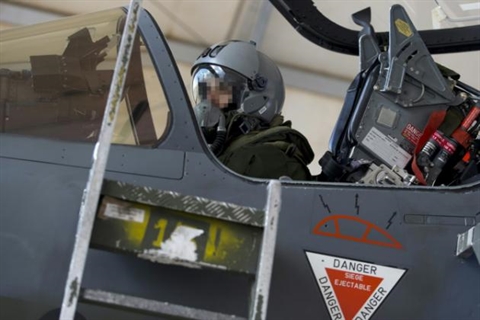 | Un pilote de l'armée française dans le cockpit d'un Mirage 2000 sur une base jordanienne de la coalition, le 1er janvier 2016. |