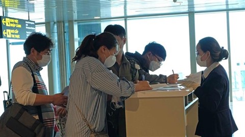| Des passagers remplissent un formulaire de déclaration médicale à l'aéroport international de Cam Ranh, province de Khanh Hoà (Centre). |