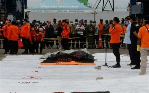 | Des sauveteurs déposent des sacs contenant des victimes de l'accident d'un Boeing en Indonésie le 10 janvier. |