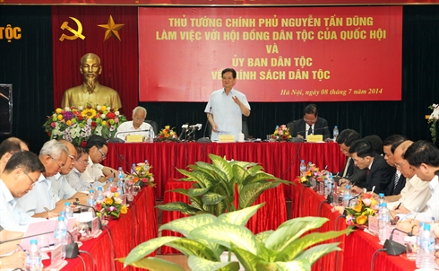 | Le Premier ministre Nguyên Tân Dung (debout) lors d'une séance de travail avec la Commission des ethnies de l’Assemblée nationale et le Comité des affaires ethniques du gouvernement, le 8 juillet à |