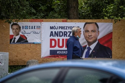 | Panneau éléctoral du président sortant Andrzej Duda le 25 juin à Varsovie. |