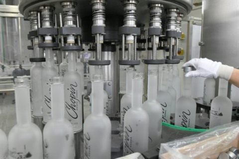 | Une chaîne d'embouteillage de vodka Chopin, le 12 juin à Siedlce, en Pologne. |