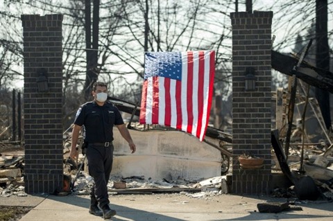 | L'agent Luis Flores sort d'une maison de Santa Rosa réduite en cendres par l'un des incendies destructeurs qui sévissent en Californie depuis une semaine. |