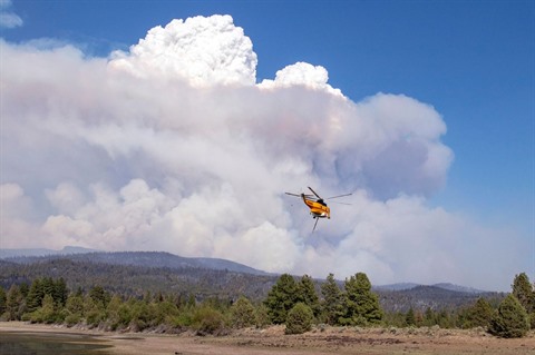 | Un hélicoptère chargé d'eau vole près du Bootleg Fire, dans l'Oregon, le 15 juillet. |