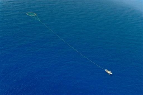 | Un thonier traîne un filet derrière lui, au Sud de Malte. |