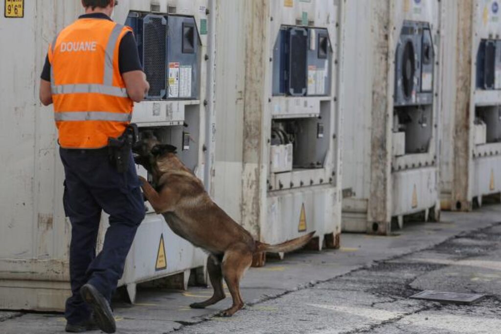 | Un chien renifle un conteneur à la recherche de drogue lors d'un contrôle douanier au port d'Anvers en Belgique. |